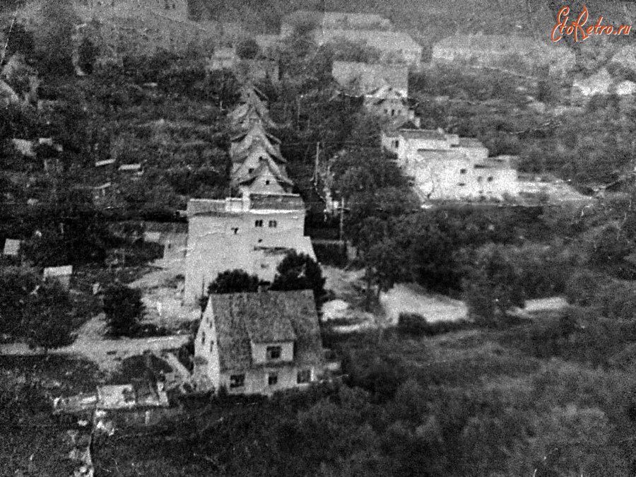 Описание старой фотографии: Фотография была сделана с дымоходной трубы, тогда еще целой, остатки которой стоят до сих пор на месте немецкого паровозного депо у железной дороги.