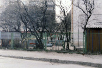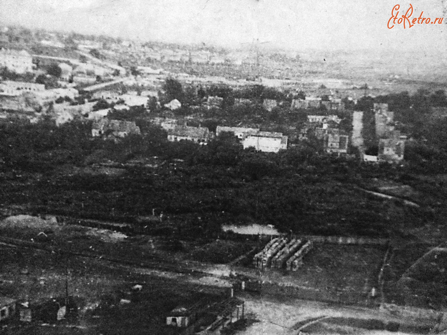 Фотография панорамы города с высоты дымоходной трубы, тогда еще целой, остатки которой стоят на месте немецкого паровозного депо. Вблизи - угольный склад КЭЧ. Дальше, справа - переулок Тихий, прямо- улица Черняховского, подальше дома улицы Победа. на горизонте - улица Суворова.