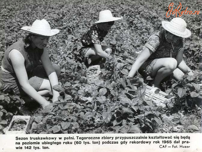 Описание старой фотографии: Трускавець. Збирання трускавок (клубники) в полі.