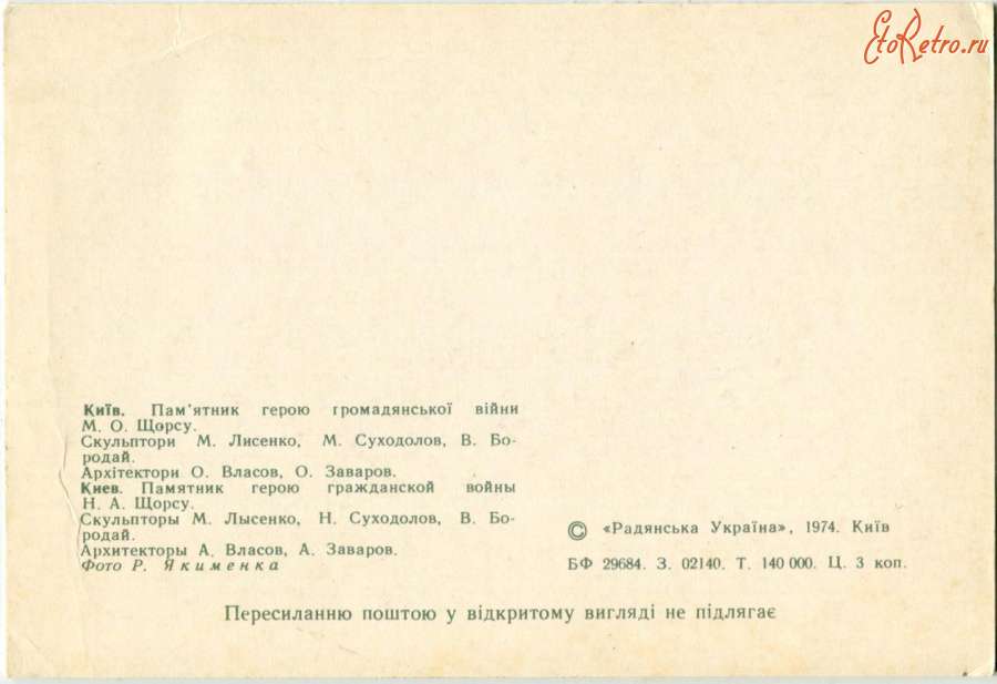 б) Если Вы нашли в разделе фотографии, которые были взяты, по Вашему мнению, с Вашего сайта, но без ссылки на Вас - просто напишите нам об этом на info@etoretro.ru - мы разместим ссылку на Вас в разделе "Киев ". Подробнее >>