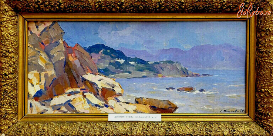 Описание старой фотографии: Картина. Картон, масло. 28х69 см. Художник Сергей Бакаев, Сергей Иванович Бакаев, 1922, Семипалатинск, Казахская ССР-2010, Ялта, Крым, 1950 . Музей краеведения и истории грязелечения, Саки, Крым, СССР. - "Золотой пляж" расположен в 5 км от центра Феодосии, в районе поселка Береговое, малом курортном центре Юго-Восточного Крыма. Цитата.