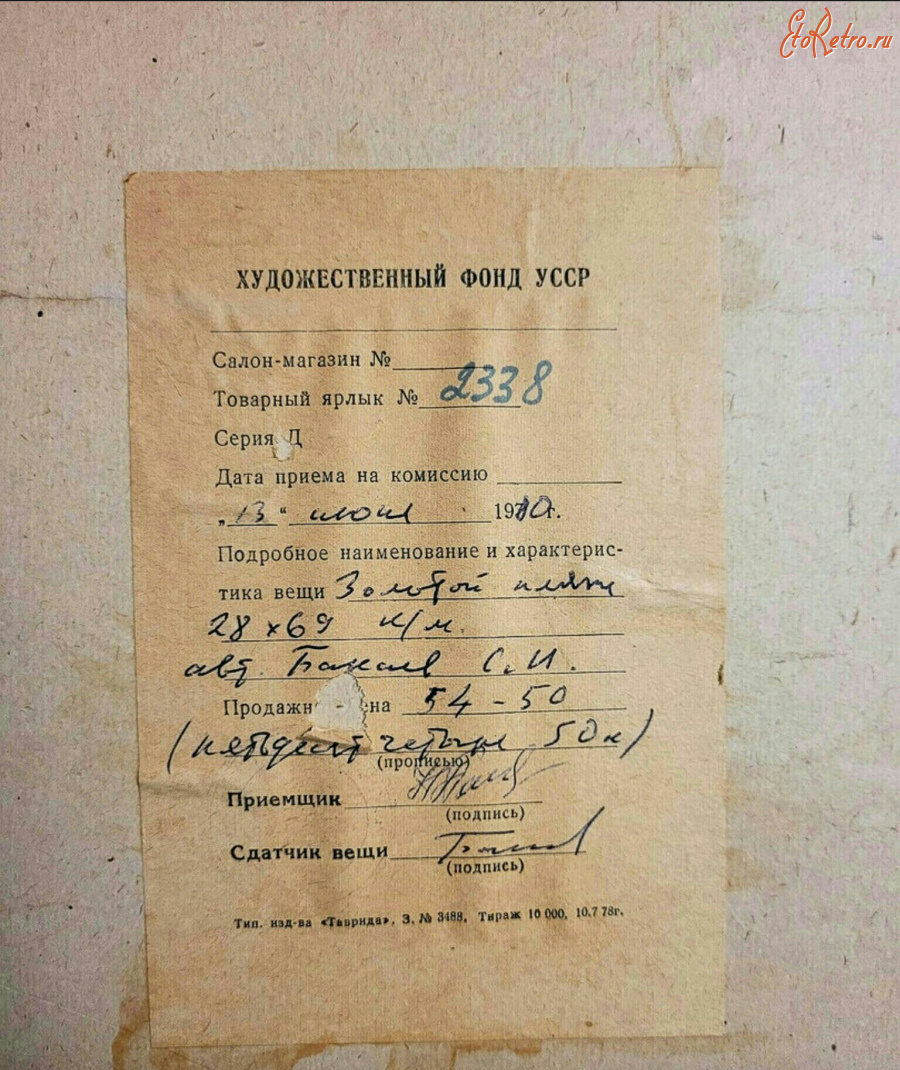 Художественный фонд УССР. Салон-магазин, товарный ярлык. Пейзаж Золотой пляж, 1950. Художник Сергей Бакаев. Куплена у автора 13 июня 1980 г. Продажная цена 54 рубля 50 копеек. Типография издательства Таврида. Цитата. Музей краеведения и истории грязелечения, Саки, Крым, УССР.