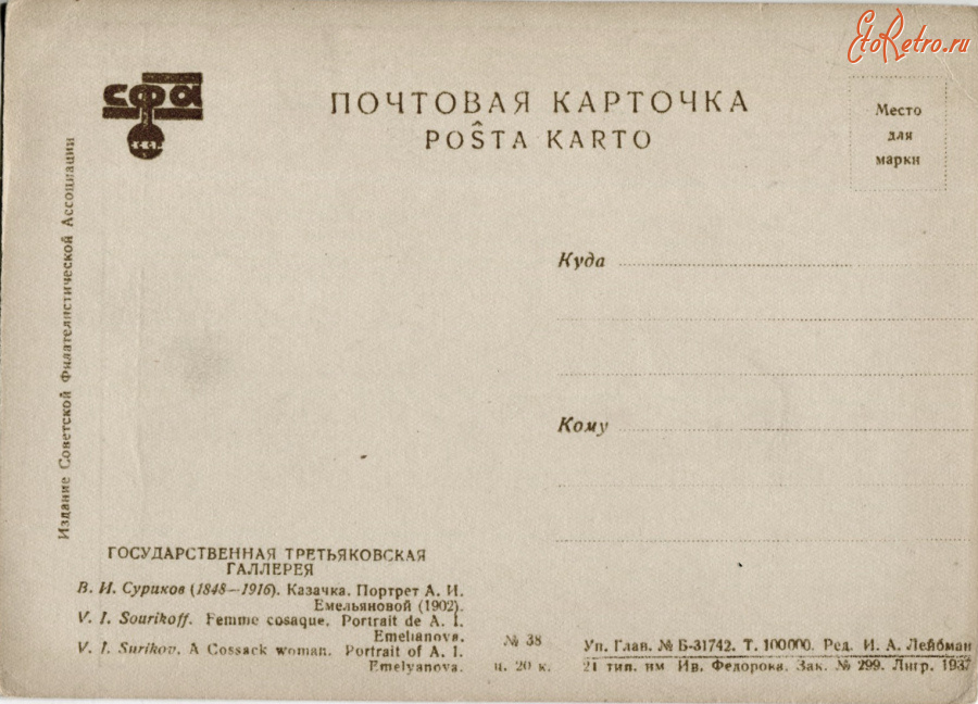 Ретро открытки - В.И. Суриков. Казачка. Портрет А.И.Емельяновой.
