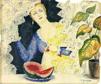 Описание старой фотографии: Рисунок. Бумага, акварель. 35,4х41,8 см. Художник Борис Кустодиев, Борис Михайлович Кустодиев, Кустодиев, 1878-1927. Аукцион искусств.