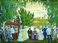Описание старой фотографии: Картина. Холст, масло. 100х125 см. Художник Борис Кустодиев, Борис Михайлович Кустодиев, Кустодиев, 1878-1927, 1909. Русский Музей, Санкт-Петербург. - На картине изображена Романовская сторона города Тутаева в Ярославской области с видом на Борисоглебскую сторону и Борисоглебский собор. Цитата.