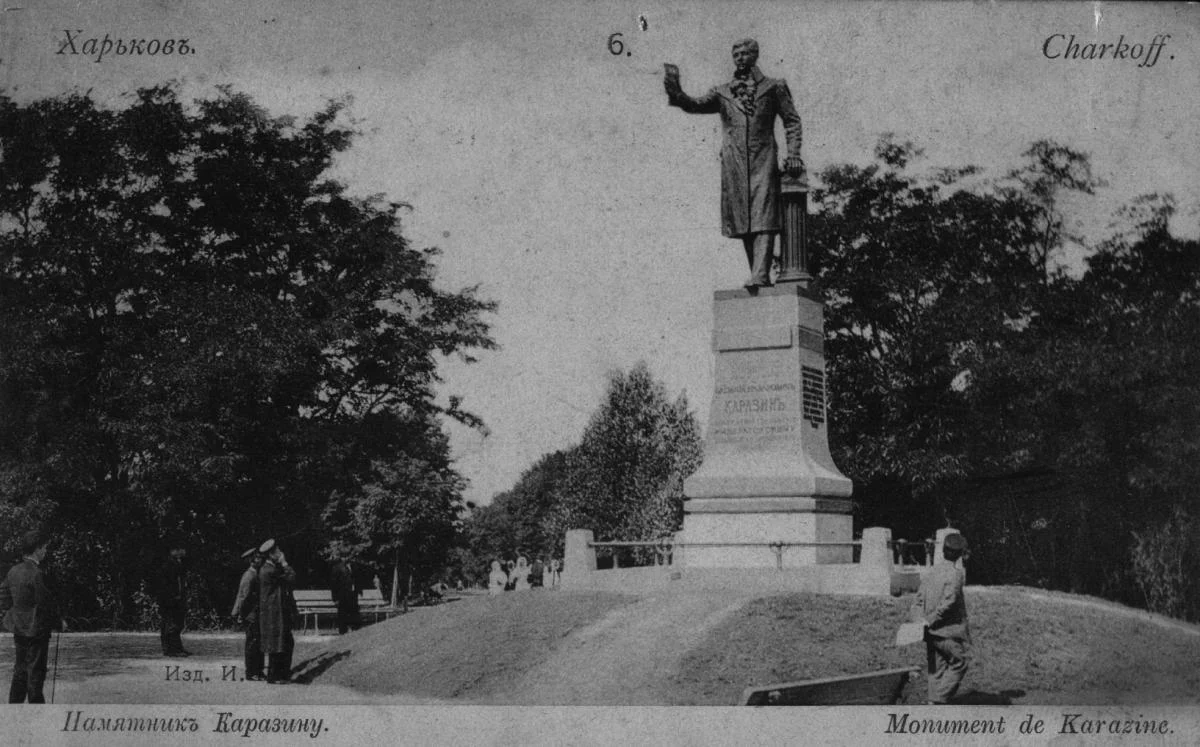 Описание старой фотографии: Памятник был спроектирован санкт-петербургским скульптором И. И. Андреолетти и построен на народные средства, которые собирались всем городом в течение почти двадцати лет. Как отметил историк Сергей Посохов: «если вы посмотрите Харьковские губернские ведомости [того периода], вы заметите: постоянно публиковались сведения о сборе пожертвований, даже если десять копеек человек сдал, то указывалась фамилия, писалось „десять копеек“ и указывалась общая сумма». Фигура Каразина была отлита из бронзы летом 1904 года и воодружена на базальтовый постамент в 1905 году в середине улицы Сумской на выходе из Университетского сада. Ввиду революционных событий 1905—1907 гг. открытие памятника затянулось. Историками отмечается, что больше года установленный памятник был закрыт досками, из-под которых торчала только бронзовая рука Каразина. Это стало поводом для множества карикатур. Местные власти опасались открывать памятник, чтобы не спровоцировать студенческие волнения и деревянный футляр с памятника сняли только в июне 1907 года.