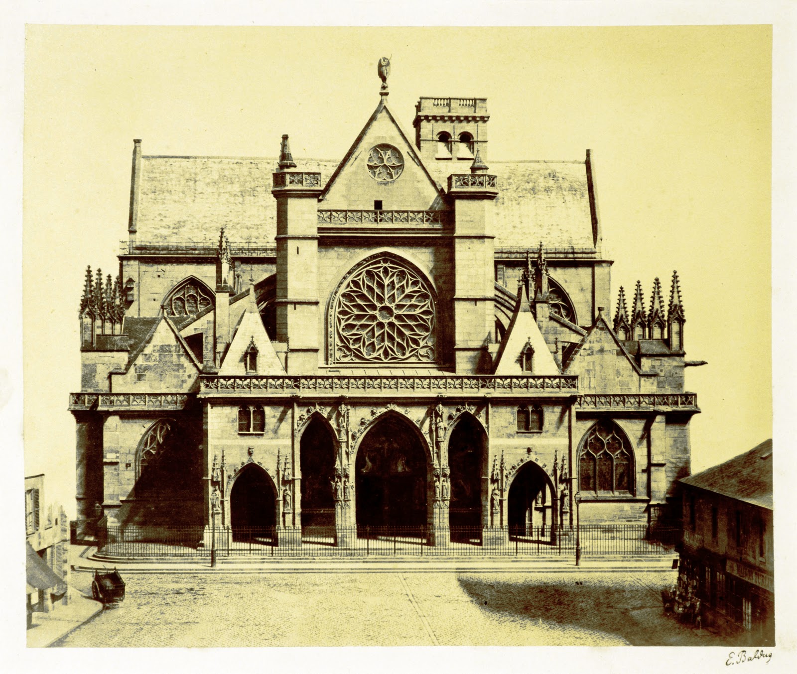 Описание старой фотографии: — церковь св. Германа (Жермена) Осерского — находится в центре французской столицы, с восточной стороны Лувра, на Луврской площади (pl. du Louvre, 2; ); Носит имя христианского святого Германа Осерского (ок. 378—448), галло-римского епископа, одного из самых почитаемых во Франции святых. Строилась и перестраивалась с XII века. Во времена, когда Лувр был королевским дворцом, Сен-Жермен-л’Оксерруа служила приходской церковью для династии Валуа. Колокольня — единственное, что сохранилось с XII в.
